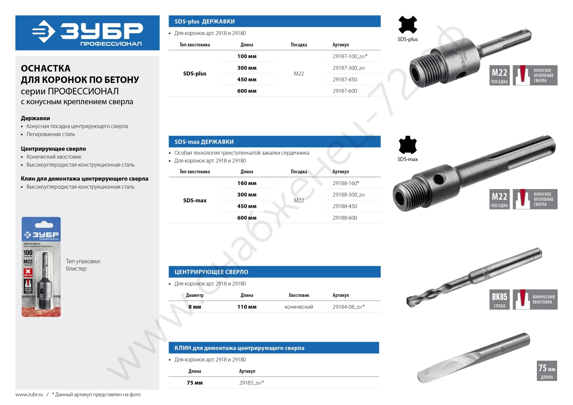Коронки по бетону используются совместно с державками и центрирующими сверлами. Широкий ассортимент оснастки ЗУБР позволяет реализовать самые сложные задачи в работе по бетону, камню и кирпичу.